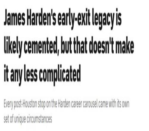 这一次的目的地是克利夫兰——在快船的征程未能如愿后,在与费城不欢而散后,在布鲁克林短暂停留后。频繁改换门庭、季后赛早早出局,这些都将成为哈登职业生涯履历中无法抹去的印记。单从纸面来看,他离开火箭后的这段生涯轨迹,确实难逃外界的诟病。
