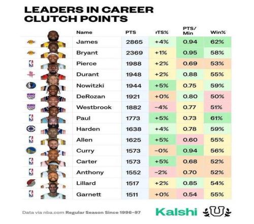 不仅仅是得分本身,更狠的是他62%的关键时刻胜率——不仅是历史得分最多,更是赢球最多。科比、库里、杜兰特这些以大心脏著称的球星,在老詹面前都成了追赶者。