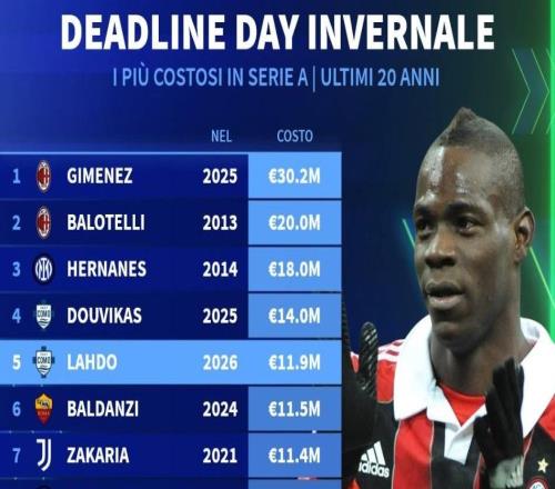 北京时间2月3日,德转统计出了2006年以来意甲冬窗截止日最贵的15笔交易,AC米兰2025年冬窗3020万欧元引进圣地亚哥-希门尼斯排名第一,2013年AC米兰2000万欧元引进巴洛特利排名第